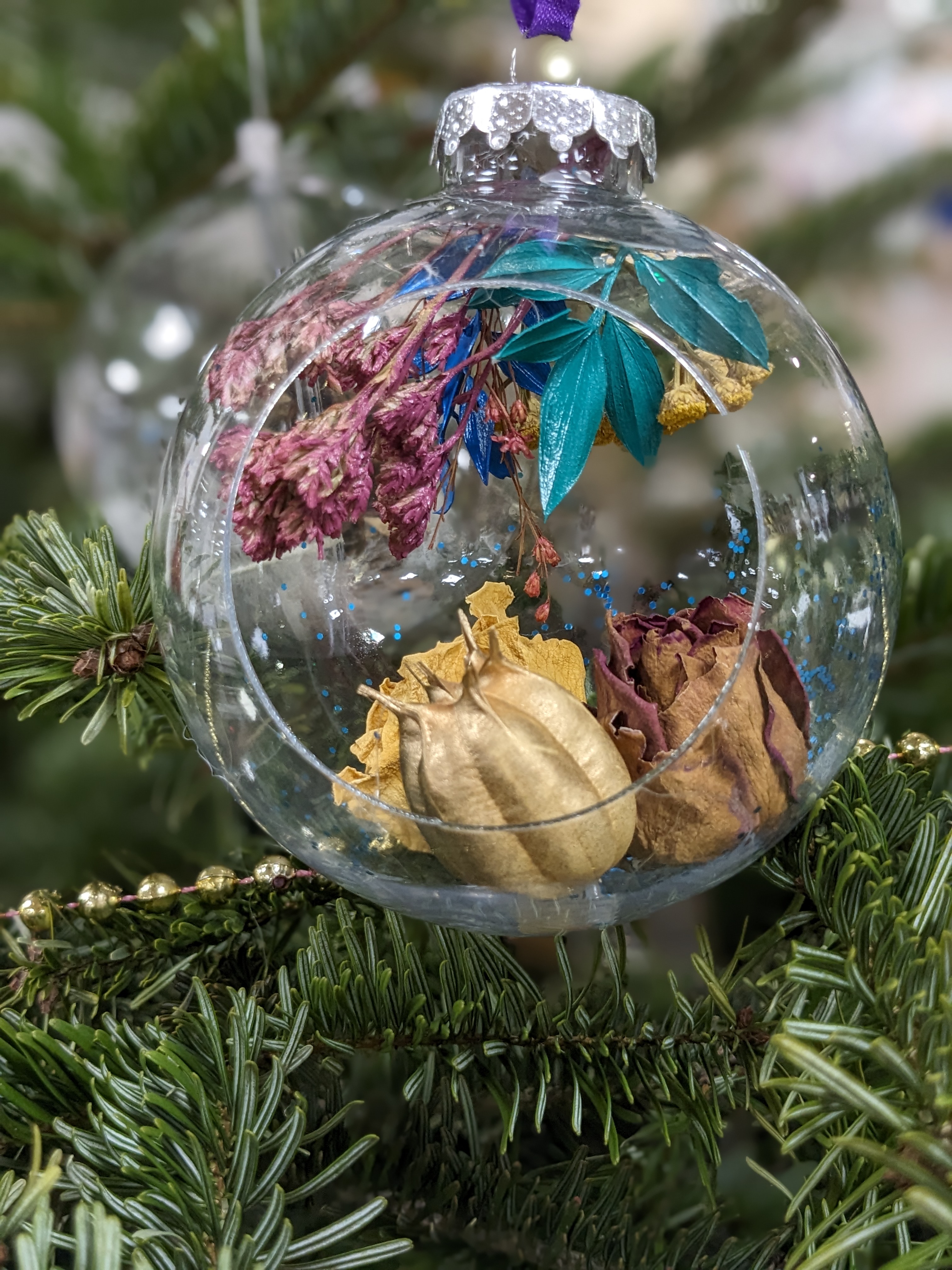 Découvrez les décorations de Noël des enfants de la médiathèque, réalisées avec l'aide de Morgane du Repère créatif. Pendant une heure, ils ont pu personnaliser leur boule en composant avec des fleurs séchées.