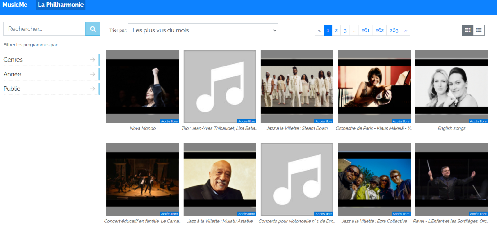 Avec La Philharmonie à la demande, vous avez accès à des concerts filmés, 150 guides d'écoute multimédias, 360 documentaires, 300 rencontres et conférences, portraits des musiciens, œuvres musicales, dossiers d’expositions… Proposés par La Philharmonie de Paris.