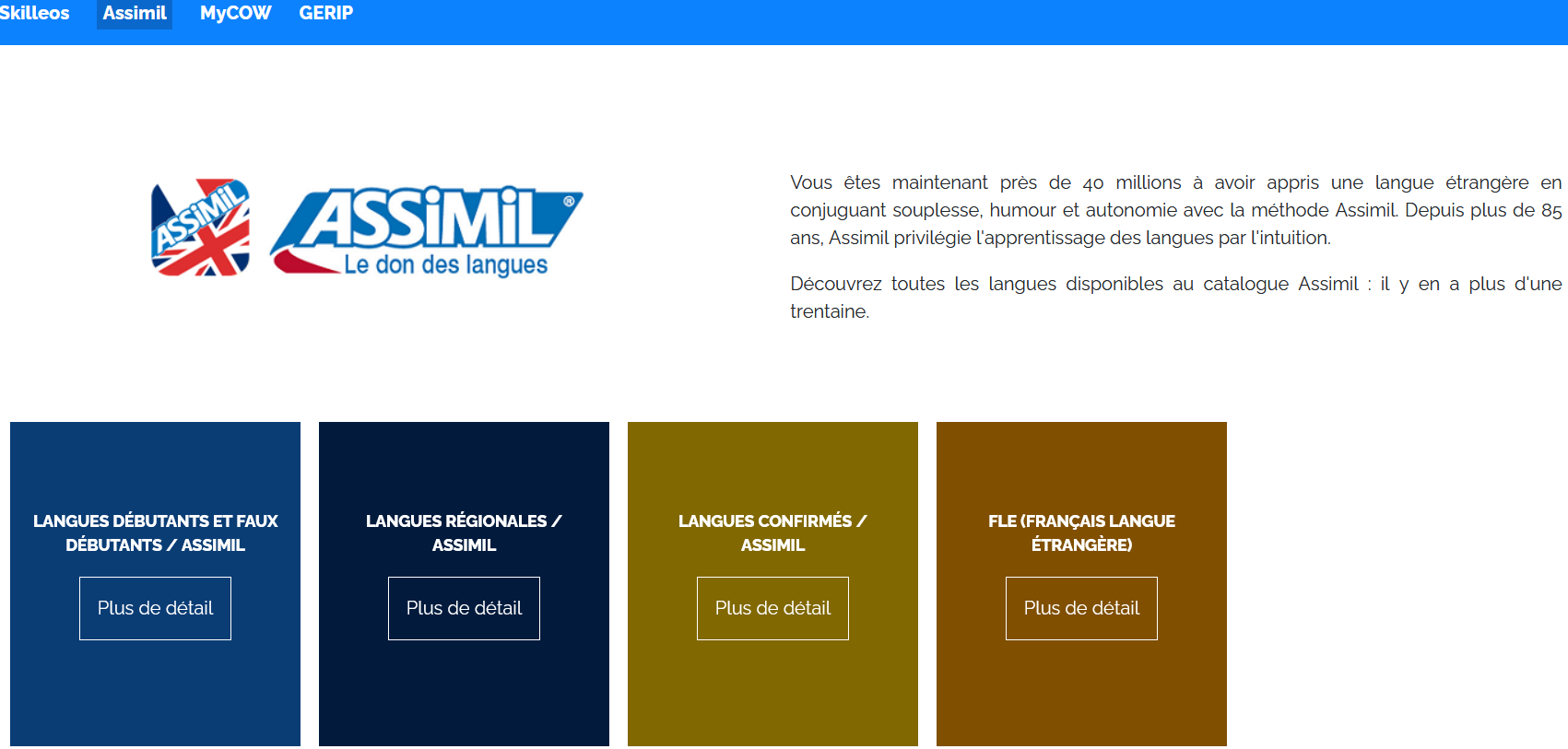 Pour l’apprentissage ou le perfectionnement d’une langue vous pourrez consulter les onglets Assimil ainsi que MyCOW.